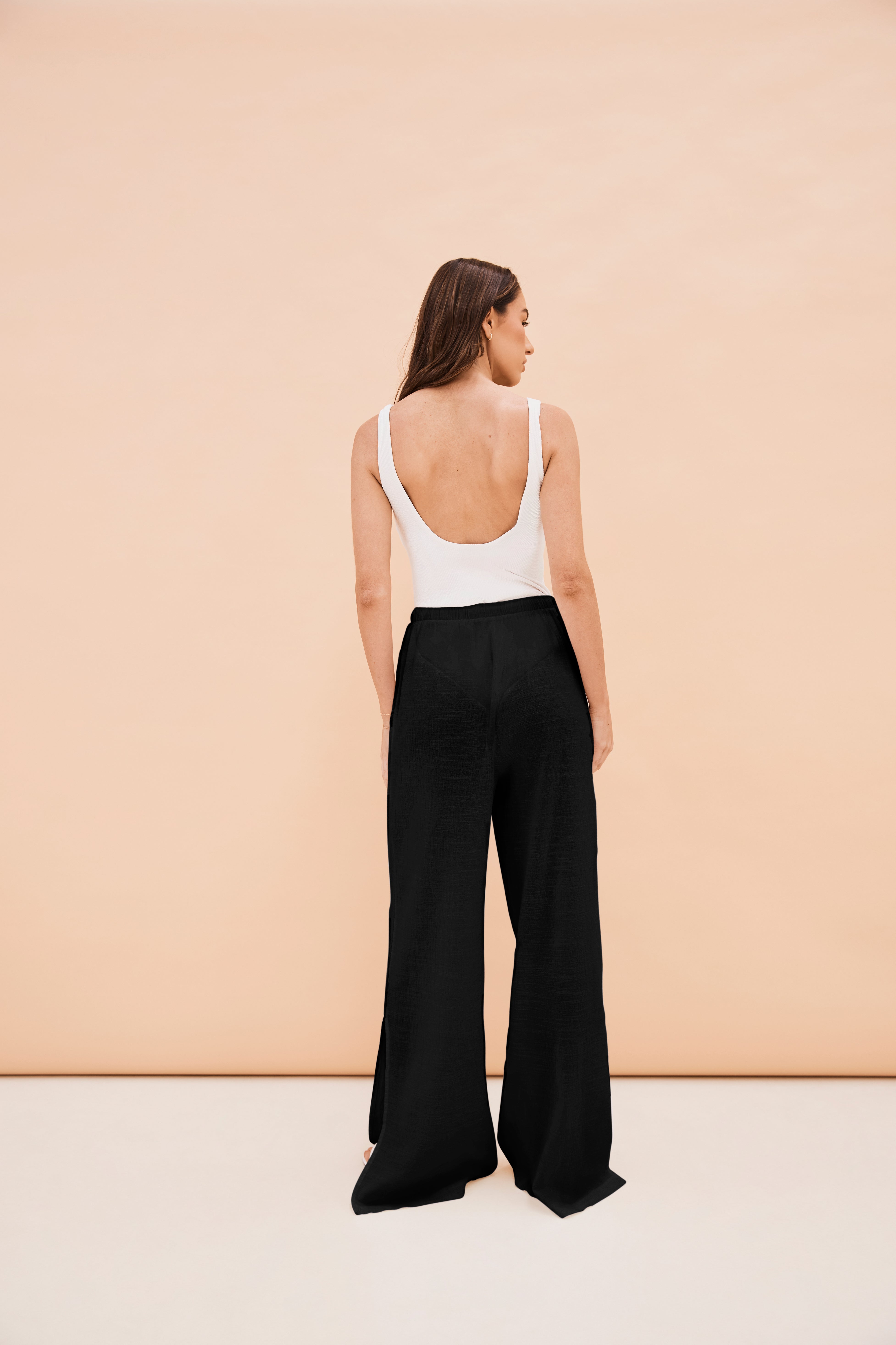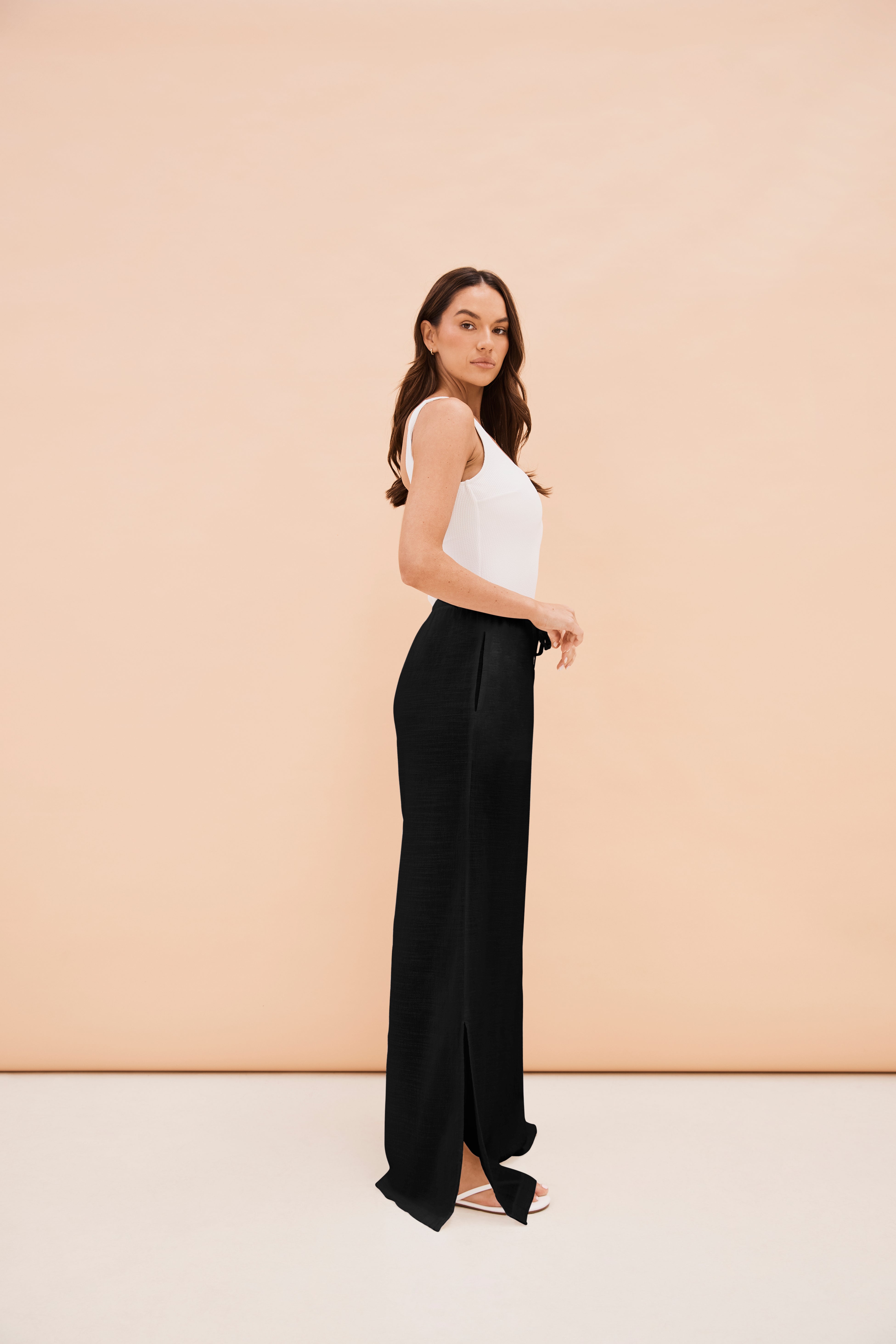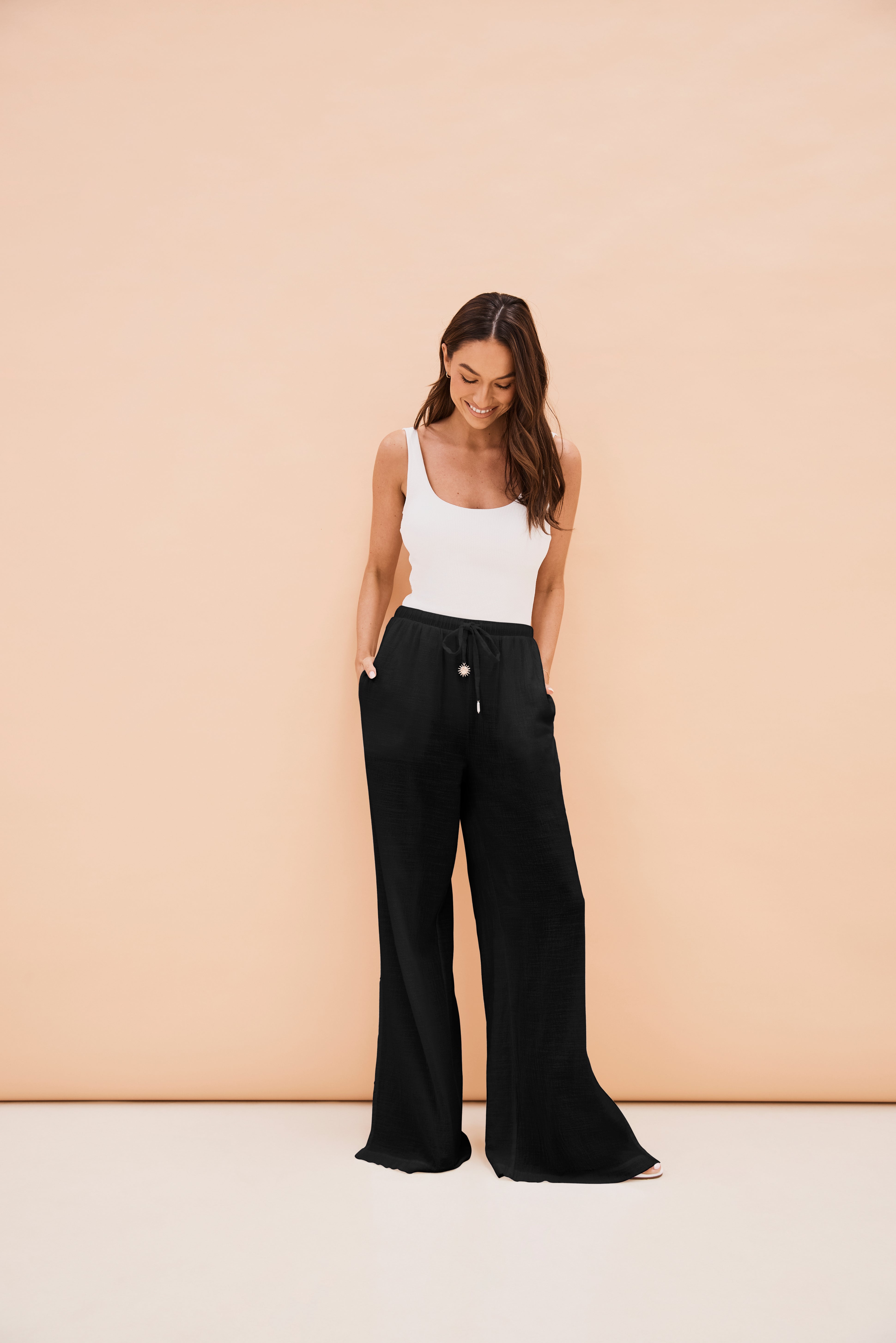 The Bianca Pants feature a soft, airy blend that drapes beautifully and feels comfortable against the skin. Designed with a drawstring waist, finished with the signature ELLOTTI sun and pearl charms, and subtle side splits for ease of movement.